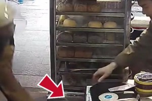 老板不小心将豆浆碰落,下一秒被外卖小哥接住