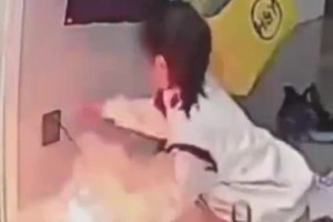 小孩姐用熨斗烫豆时突然着火 反应迅速第一时间拔掉电源